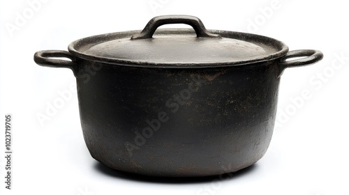 A sturdy black iron pot with a sleek design, isolated on a white background, emphasizing its durability and vintage charm for kitchenware concepts.