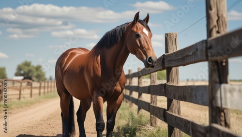 A sturdy ranch horse stands calmly beside a wooden fence, its sleek coat shining under the open sky, embodying the spirit of rural life without showing any human presence.