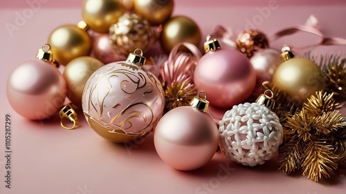 A stylish arrangement of gold, white, and pink Christmas baubles on a pink backdrop creates a festive atmosphere. Ideal for holiday greetings and new year celebrations