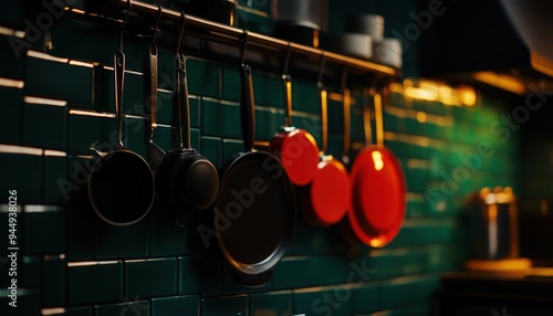 A stylish arrangement of hanging cookware in a modern kitchen featuring vibrant colors and elegant design.