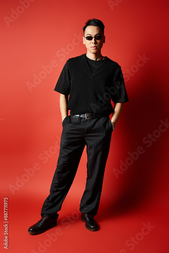 A stylish Asian man in black attire stands boldly against a vibrant red backdrop in a striking visual composition.