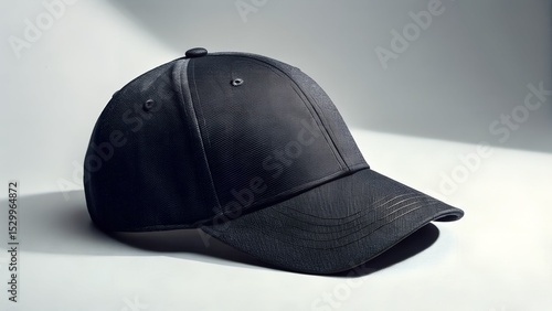 A stylish black baseball cap showcasing texture and modern design elements neatly illuminated