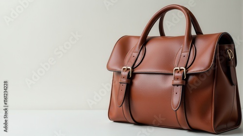 A stylish brown leather satchel with adjustable strap and buckle detailing, set against a soft beige background