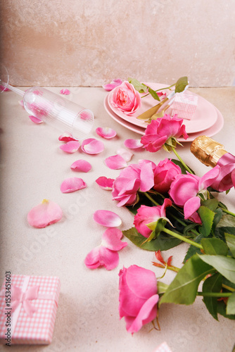 A stylish flat lay featuring fresh roses, golden cutlery, a champagne glass, and a small pink gift box.