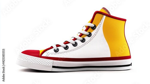 A stylish high-top s sneaker in yellow and red features a classic design with white accents perfect for casual wear and adding a pop of color to any outfit.