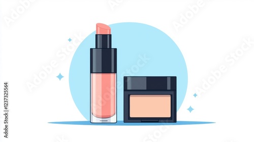 A stylish illustration of a lipstick and compact powder, set against a light blue circle, capturing the essence of beauty and cosmetics.