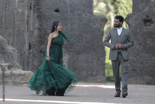 A stylish Indian couple poses affectionately at an ancient stone monument. The woman wears a flowing dark green gown, and the man is dressed in a classic three-piece suit.