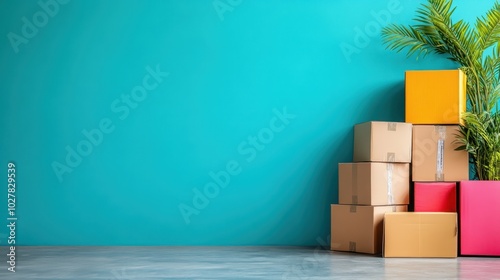 A stylish interior scene features a potted plant and a neat stack of cardboard boxes against a teal wall, balancing natural and urban elements harmoniously.