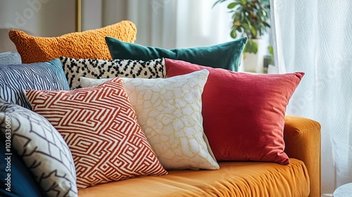 A stylish living room filled with bright pillows in various textures and playful designs, adding energy and charm