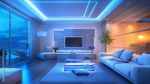 A stylish living room illuminated by blue and white lights, featuring a TV, cozy seating, and large windows with a view of the evening sky