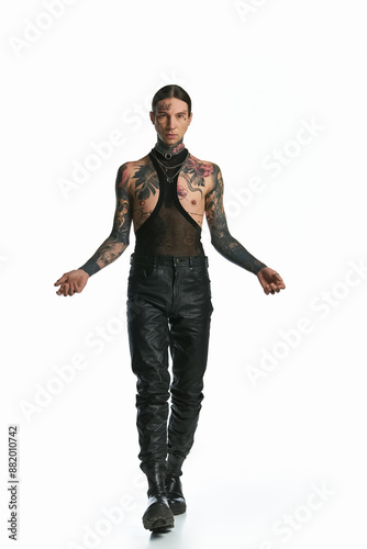 A stylish man covered in tattoos confidently walking down in a white studio setting.