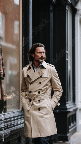 A stylish man stands outside a boutique wearing a beige trench coat. He has long dark hair and a well-groomed beard, exuding confidence in an urban setting.