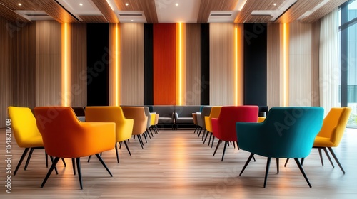A stylish meeting room featuring a vibrant arrangement of colorful chairs, designed for collaborative discussions and team engagement in a professional environment.