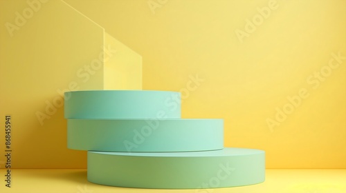 A stylish model podium in pastel mint green, featuring a tiered design with smooth edges. The podium stands out against a pastel yellow backdrop