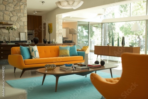 A stylish, modern living room with a mid-century design flair.