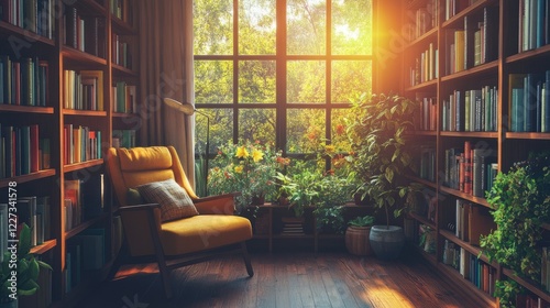 A stylish Scandinavian home library with minimalist wooden bookshelves, a cozy reading chair, and warm sunlight through a large window