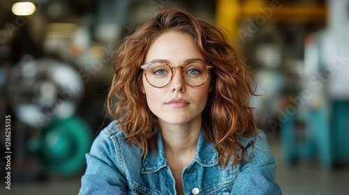 A stylish woman in a denim jacket and glasses stares confidently at the camera, showcasing her expressive personality in a creative industrial setting.