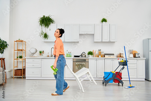 A stylish woman in casual clothes stands in a kitchen, confidently holding a mop.