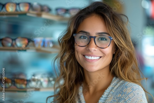 A stylish woman wearing glasses smiles confidently at the camera, exuding warmth and charm as she stands among shelves of fashionable accessories