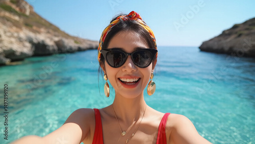 A stylish young woman wearing sunglasses and a red swimsuit takes a cheerful selfie with crystal-clear turquoise waters and rocky cliffs in the background on a sunny day.