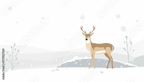 A stylized template featuring a deer standing in a serene snow-covered landscape, designed in a flat design style with clean lines, simple shapes