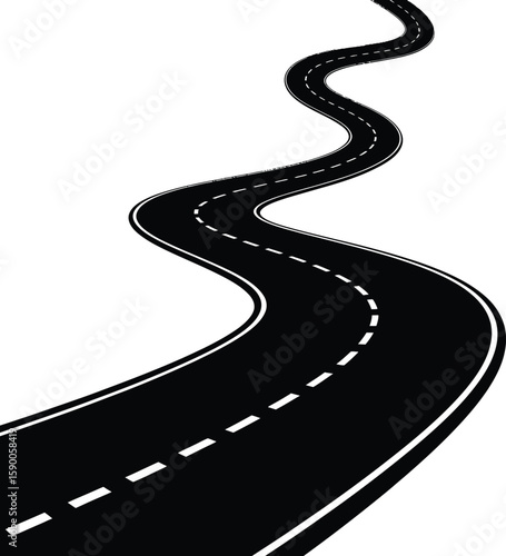 A stylized, black and white illustration of a winding road stretching into the distance.