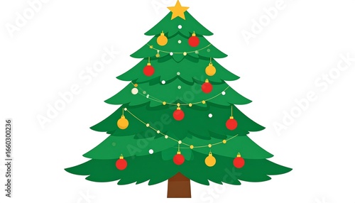 A stylized christmas tree, adorned with decorative balls and lights, is showcased against a pure white background.