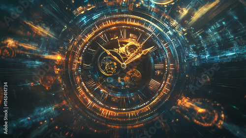 A stylized clock face with gears and cogs visible beneath the surface, surrounded by swirling clock hands and radial lines, symbolizing the complexity of time. Chronos. Illustration