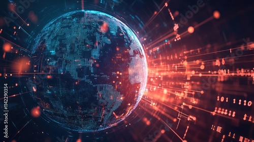 A stylized glowing globe surrounded by rotating binary streams and connection nodes, side view, showing the interplay of global data exchange, cybernetic tone, colored pastel