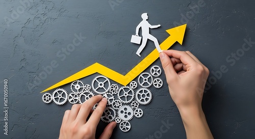 A stylized graphic representation of professional growth, illustrated with a figure ascending a yellow arrow chart supported by interconnected gears.