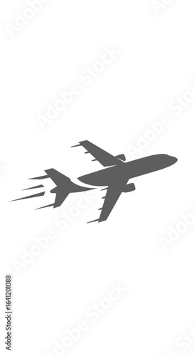 A stylized grey airplane soaring through the air with motion trails, indicating speed and flight.