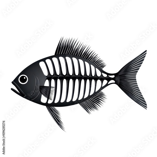 A stylized illustration of a fish skeleton, showcasing intricate details of bones and fins in a minimalistic black and white design.