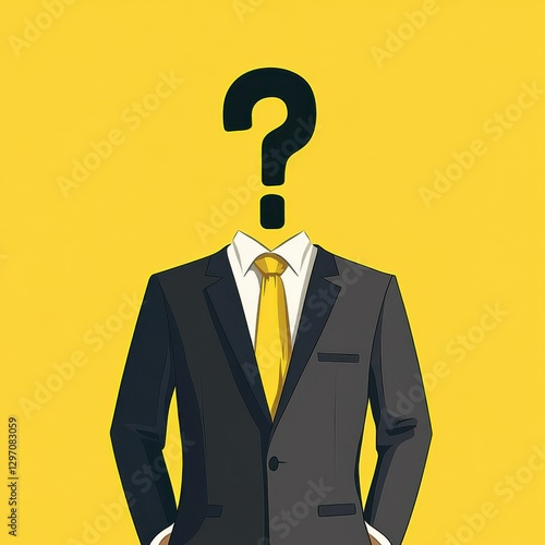 A stylized illustration of a man in a suit with a head replaced by a question mark, set against a bright yellow background.