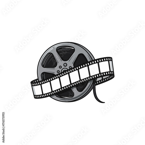 A stylized illustration of a vintage film reel and filmstrip, isolated on white.