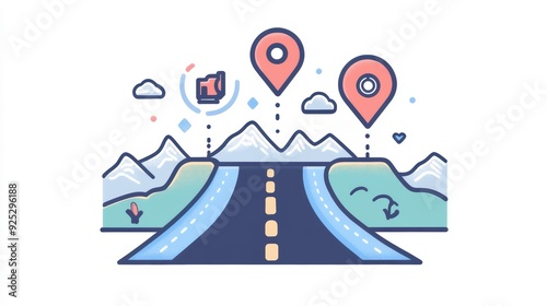 A stylized illustration of a winding road leading to mountains, featuring location markers, clouds, and greenery, symbolizing travel and exploration