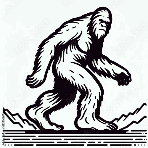A stylized illustration of Bigfoot, walking across a mountainous landscape.