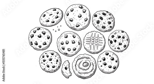 A stylized line art drawing of classic cookies arranged in a circle, centered on a plain white background