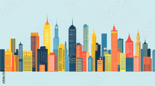 A stylized New York City skyline unfolds, featuring flat vector buildings, towering skyscrapers, and office towers against a clear blue sky.