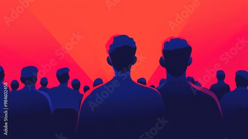 A stylized silhouette of an audience facing a vibrant, red and blue background, evoking a sense of anticipation and collective energy.