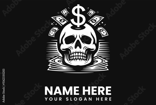 A stylized skull sits atop a stack of money, with a dollar sign floating above its head, symbolizing the pursuit of wealth and its potential cost.