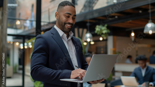 A successful brutal freelancer or CEO. A stylish guy uses a laptop, browses the Internet, looking for ideas for a project, standing in the office