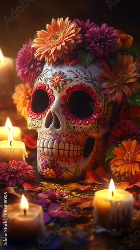 A sugar skull decorated with vibrant flowers, surrounded by flickering candles and warm hues. The focus is on the face, in a front view, with a Day of the Dead style background, soft lighting