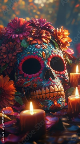 A sugar skull decorated with vibrant flowers, surrounded by flickering candles and warm hues. The focus is on the face, in a front view, with a Day of the Dead style background, soft lighting