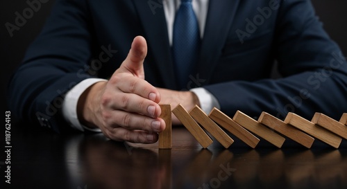 A suited businessman prevents dominoes from falling, symbolizing risk management, leadership, and strategic decision-making.