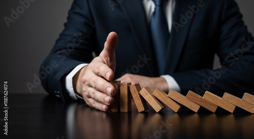 A suited businessman prevents dominoes from falling, symbolizing risk management, leadership, and strategic decision-making.