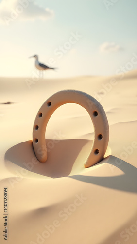 A sun-bleached horseshoe half-buried in textured sand. Distant seagull and warm tones for a tranquil beach-themed HD artwork.