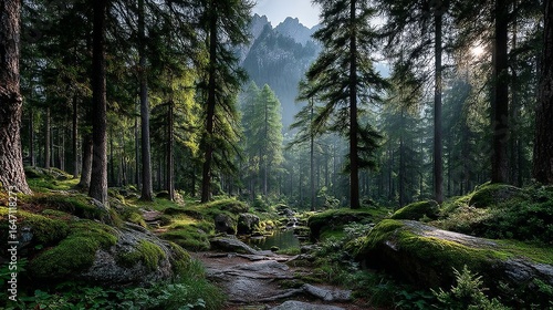 A sundappled forest path winding through tall evergreen trees with mosscovered rocks and lush undergrowth