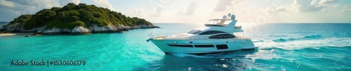 A sun-drenched yacht glides across turquoise waters, surrounded by lush islands under a vibrant summer sky The epitome of lavish summer escapes , sky, paradise