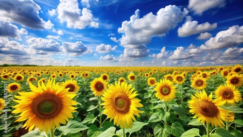 A sunflower field in full bloom against a bright blue sky with fluffy white clouds and green grass stretching towards the horizon , fields, landscape