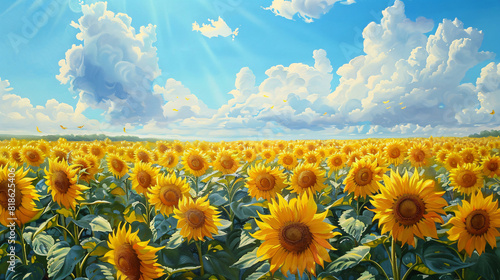 A sunflower field oil painting on canvas, with bright yellow flowers under a clear blue sky